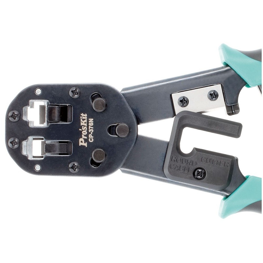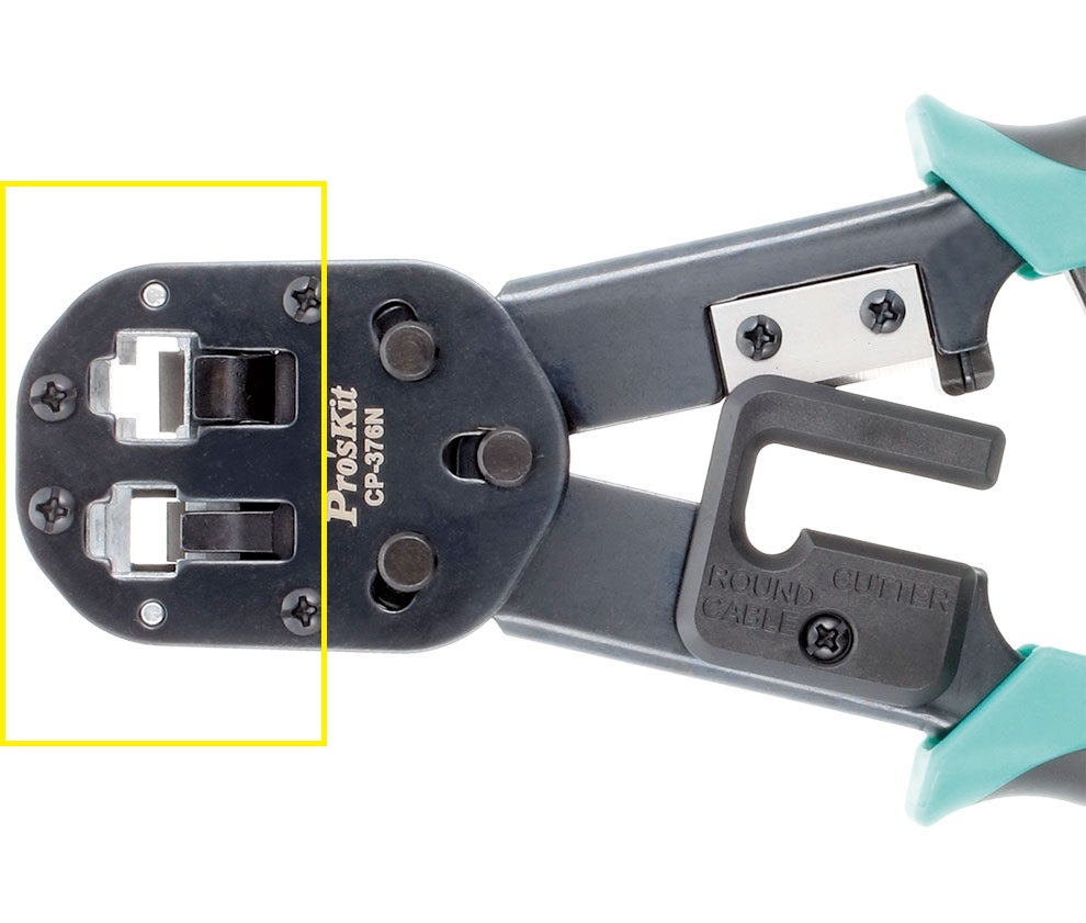Crimpadora de actuación vertical compatible con conectores modulares RJ45, RJ11 y RJ12. Tiene dos boquillas en función del conector y cableado que se quirra crimpar.