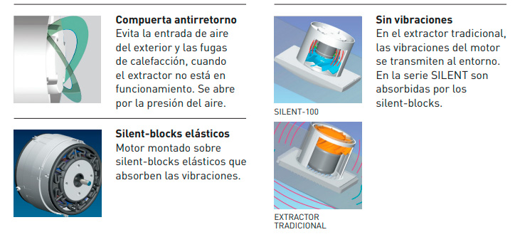 Incluye luz piloto de funcionamiento, compuerta antirretorno y motor 230V-50Hz con rodamientos a bolas, montado sobre silent-blocks.