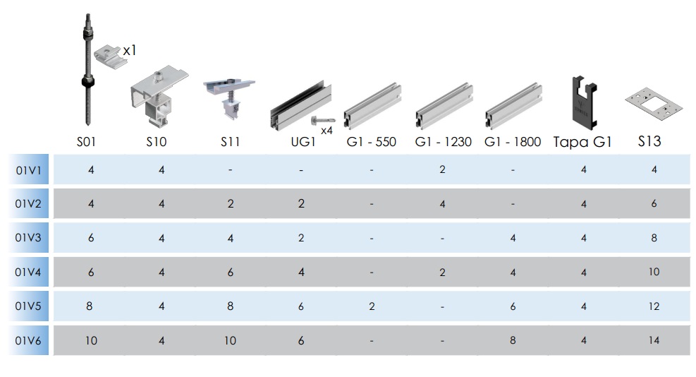 El kit incluye todo el material necesario para realizar la instalación de la estructura.