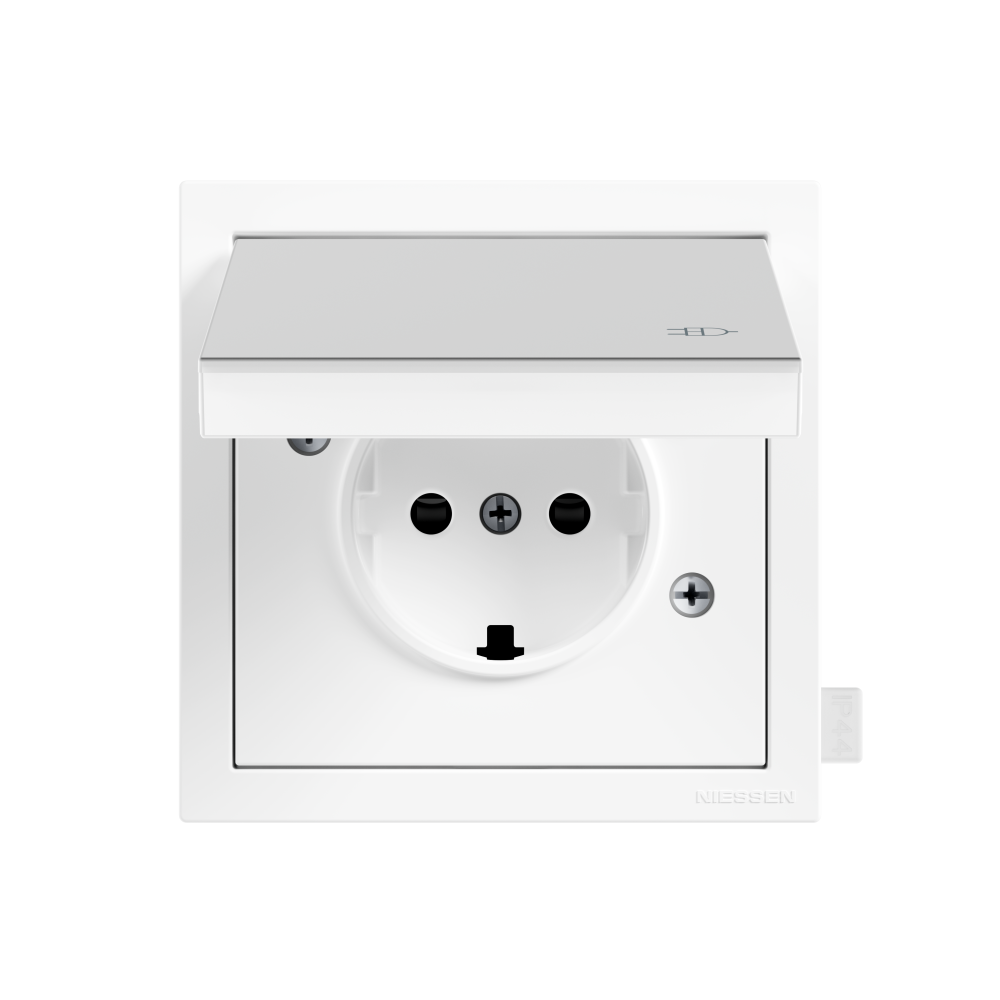 La tapa base enchufe Schuko con tapa Niessen Vega 8888.1 es un elemento funcional y decorativo que forma parte de la serie Niessen Vega. Está diseñada para cubrir y proteger la base de enchufe con toma de tierra (T.T.) de tipo Schuko, incorporando una tapa abatible que ofrece una mayor seguridad y protección frente a la humedad, el polvo o posibles contactos accidentales.