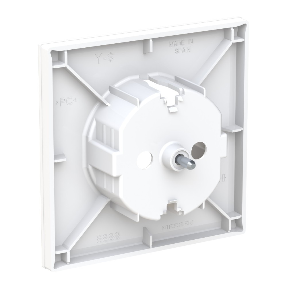 La tapa base enchufe Schuko T.T. lateral Niessen Vega 8888 es un componente funcional y decorativo que forma parte de la serie Niessen Vega. Está diseñada para cubrir y proteger la base del enchufe con toma de tierra (T.T.) de tipo Schuko, ofreciendo una conexión segura, fiable y perfectamente integrada en el conjunto de mecanismos de la instalación. Su salida lateral para el cable facilita la conexión en espacios reducidos o cuando el enchufe se encuentra próximo a paredes o muebles.