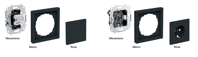 La instalación es muy sencilla: primero se elige el mecanismo según la función eléctrica que se necesite (por ejemplo, interruptor simple o doble, conmutador, enchufe, etc.). Después, se selecciona la tecla o tapa correspondiente, y finalmente se añade el marco embellecedor.